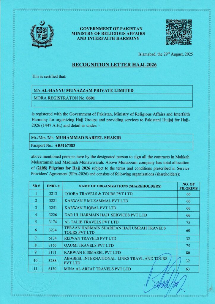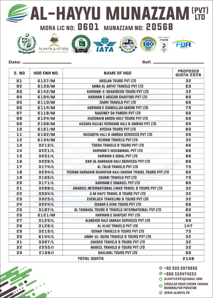 M/S.Al Hayyu Munazzam (Private) Limited, a Munazzam Company (DHC), duly registered with SECP as a Private Limited Company for the purpose of Al-Hayyu Hajj services in Bahawalpur Munazzam and Management of Pilgrims Affairs during Hajj Operation-MORA LIC 0601 SAUDI MUNAZZAM NO 20568.
